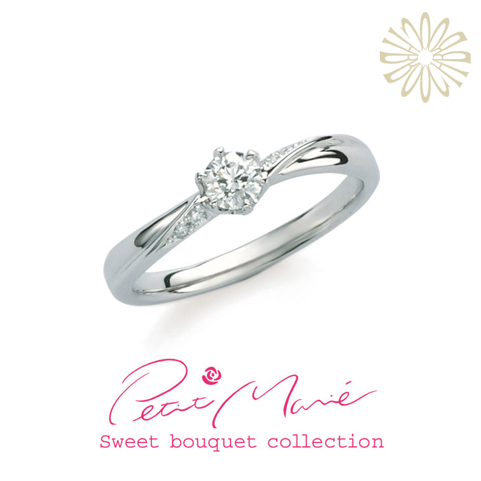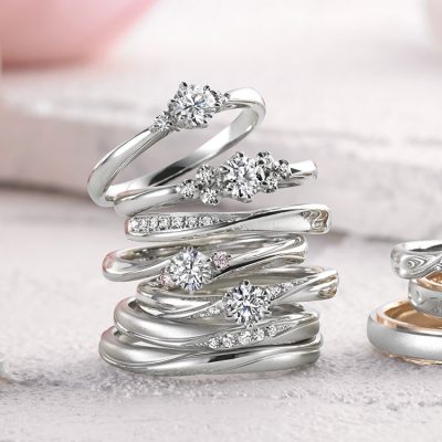 - 流れるようにメレダイヤモンドをセットした、上品でエレガントなデザインの婚約指輪。