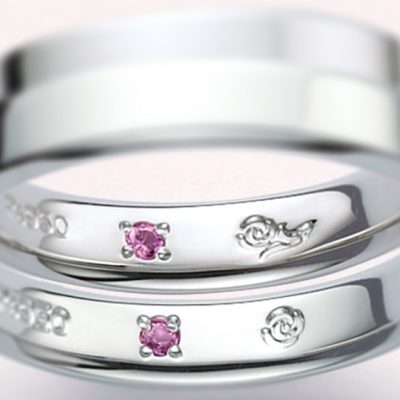 指輪内面に薔薇のブーケ・ブートニア刻印とローズサファイアが入ります。