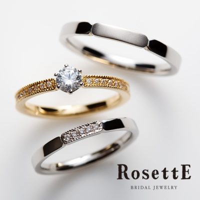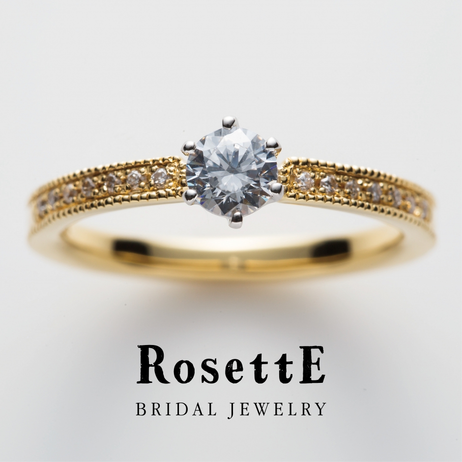 サイドのメレダイヤとたくさんのミル打ちが、二人の新たな人生を祝福するよう華やかに輝き、クラシカルな仕上がりの婚約指輪。 - [ER]