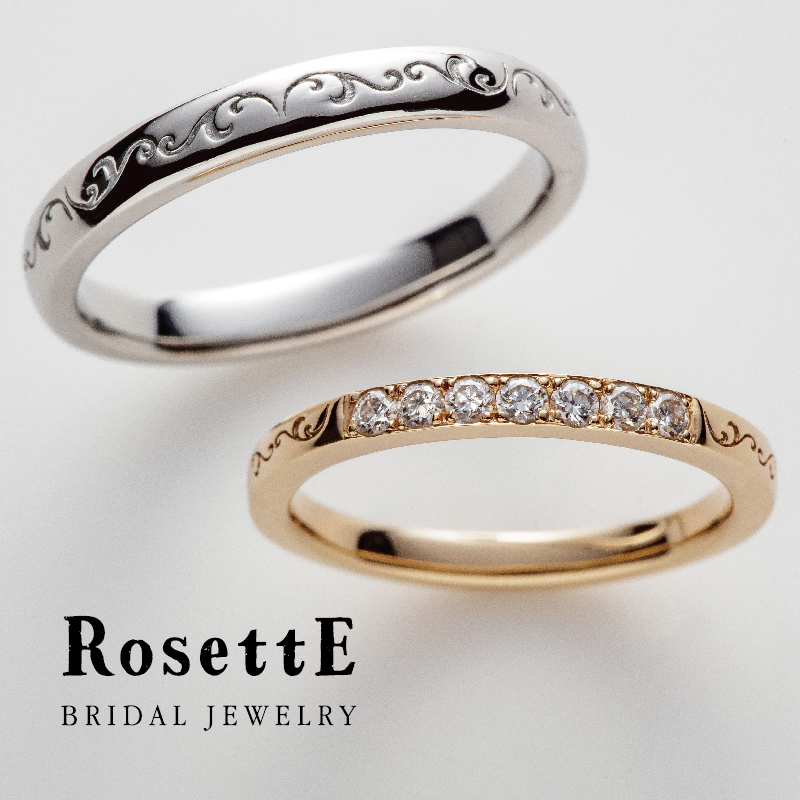 メンズ、レディース共にバラのつるをイメージした仕上がりの結婚指輪。