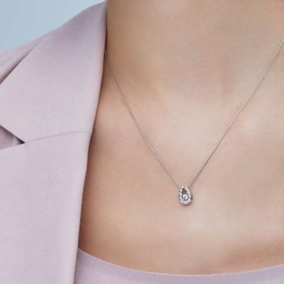 センターストーンを囲うモダンなモチーフを添えたネックレス。