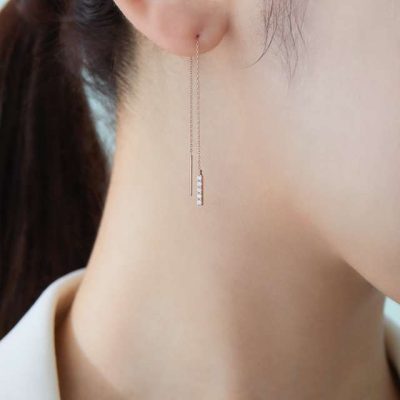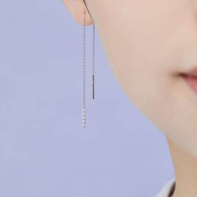 ダイヤモンドが真っすぐに連なり、エレガントな印象を残すロングチェーンピアス。
