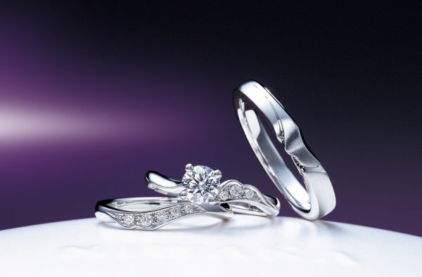 誰も見たことのない想像上の花が婚約指輪のデザインに据えられているなんて、面白い。まるで花嫁(自分自身)のことをそのくらい類稀な運命のもと出会えた存在と相手が思ってくれていると思ったら、これからの日々「唐花」を身に着け、見つめるたびに、くすっと笑みがこぼれてしまいそうだ。和名ならではの、リングの意味がダイレクトに伝わり、いい具合に想像を付加してとらえることができる。「大人花嫁」の上質なウエディングシーンを作り出す、NIWAKA~俄(にわか)のウエディングリングはそんな未来を想像できる和テイストさが人気の秘密なのかもしれない。