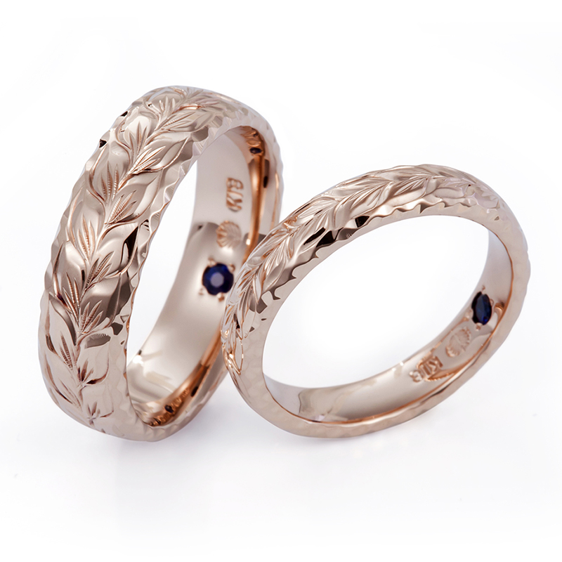 ハワイアンジュエリーとは約140年の歴史を持ち、ハワイ独自の伝統的に育まれてきた模様が彫り込まれた製品のことをいいます。ハワイアンジュエリーのブランドは様々ありますが、MAKANA(マカナ)の婚約指輪(エンゲージリング)・結婚指輪(マリッジリング)は鍛造リングを日本で作り、その鍛造リングにハワイの熟練の職人が本格手彫りを施す二か国作成で作っています。キャスト(鋳造)や第三国などの未熟な彫りとは違い、圧倒的な存在感と本物ならではの迫力があります。