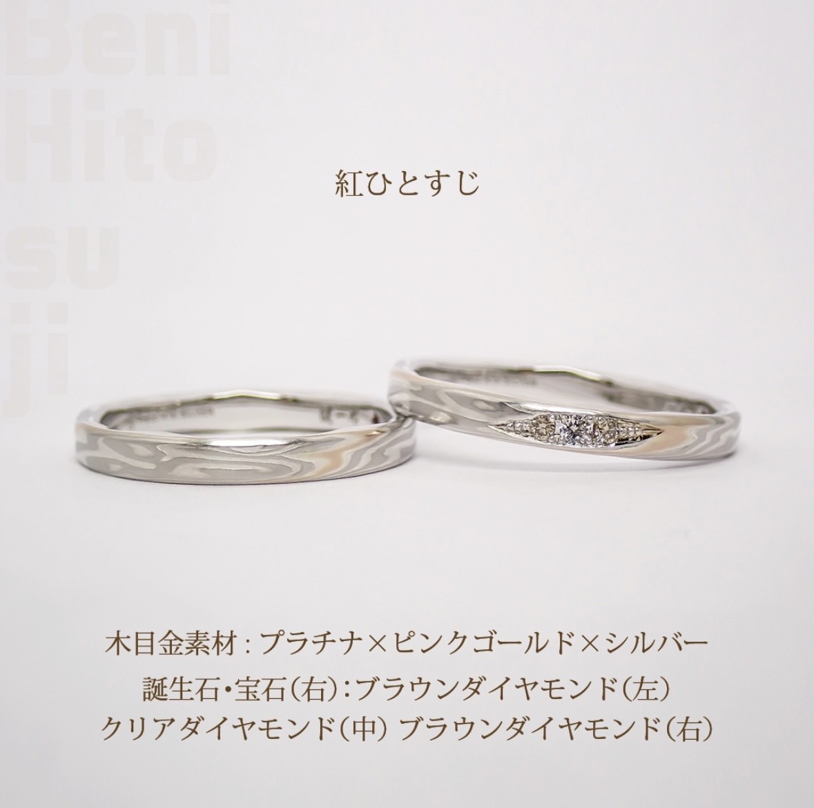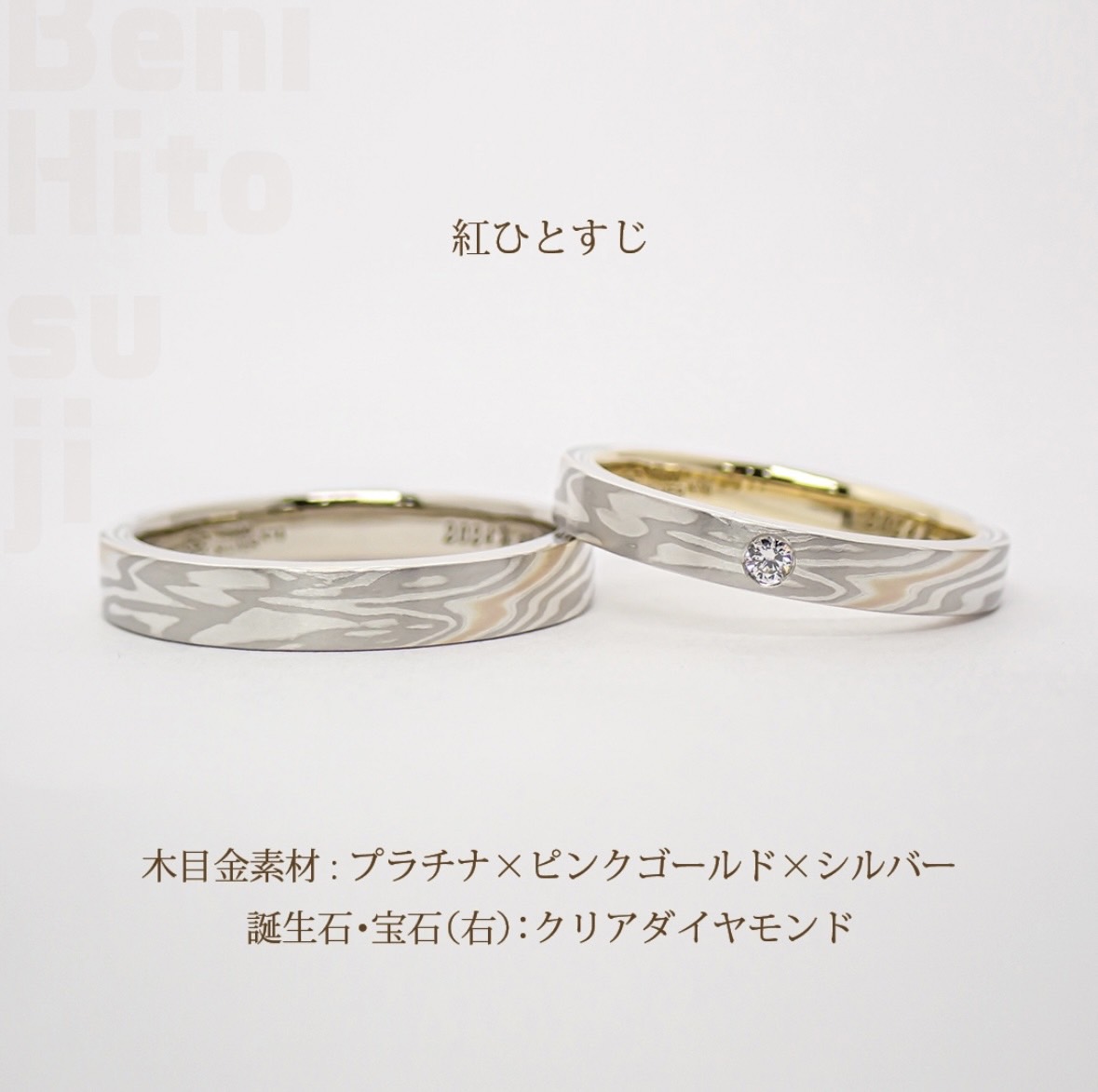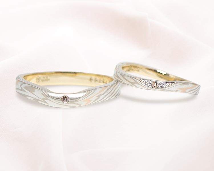 江戸時代から伝わる金属で木目模様を再現するという、日本の伝統工芸技法を用いて、結婚指輪を仕上げています。