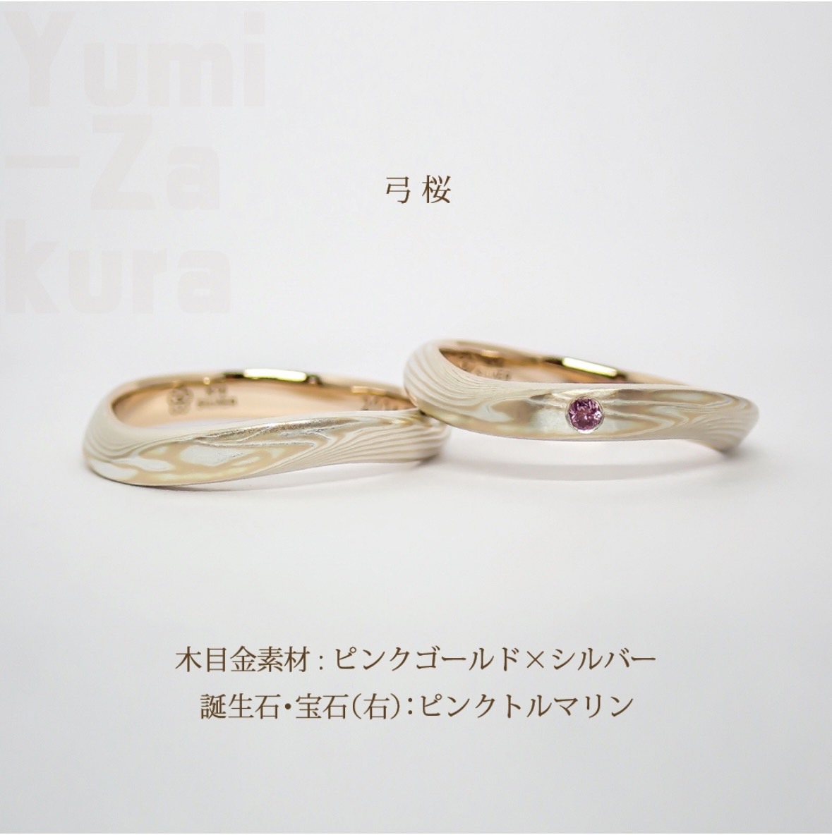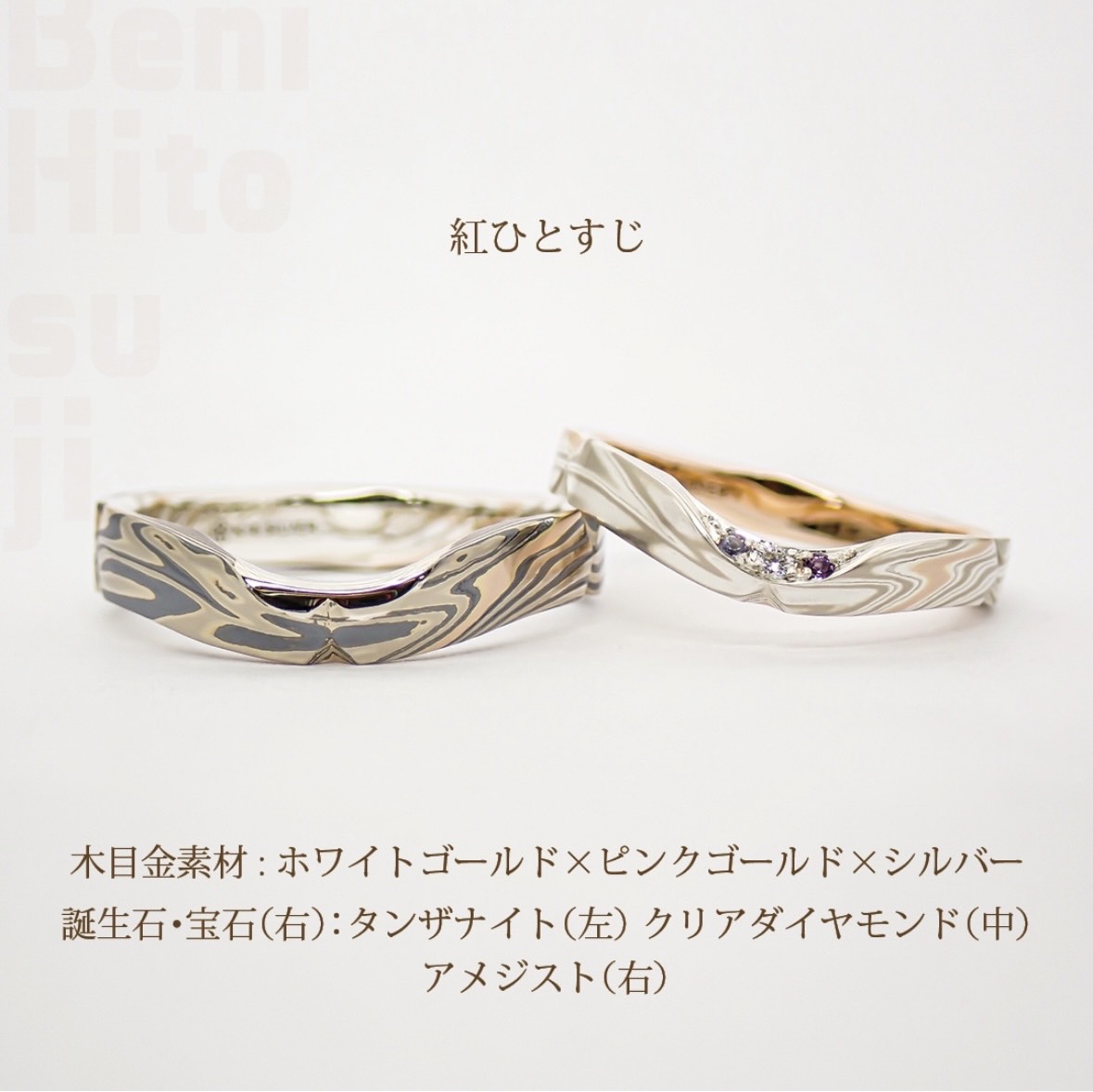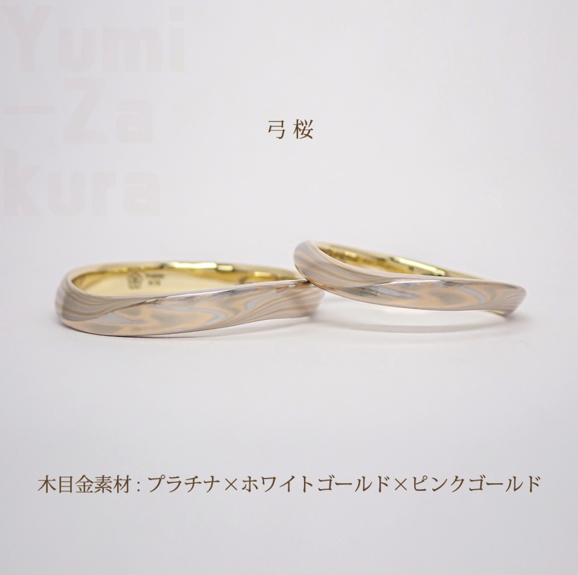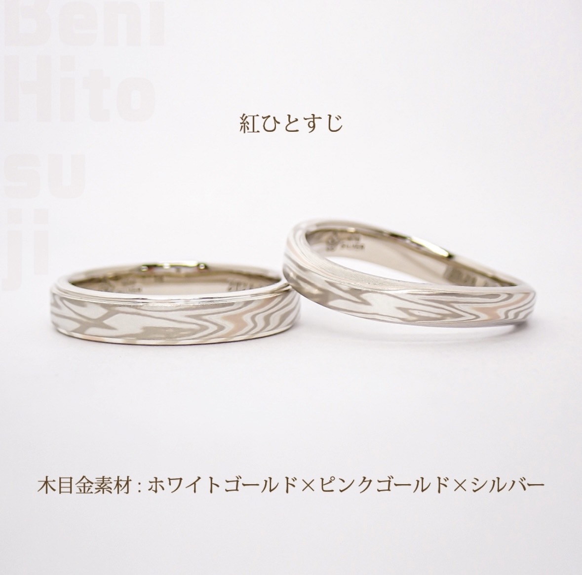 写真は全て紅ひとすじと呼ばれる、ピンクゴールドのラインが一筋木目模様としてでる杢目金屋でも人気の木目です。