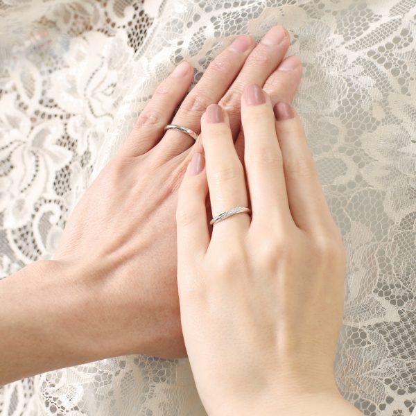 王道のストレートラインはどんな服装にもなじみやすく、20代に限らず幅広い世代に人気。しかし、センターにメレダイヤをあしらったり、表面加工に変化をつけたりすることで、他の人とかぶらない「さりげない個性」が演出できます。