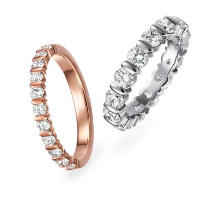 結婚指輪にも、メインのダイヤモンド以外にも多くのメレダイヤモンドが使われていて、華やかなデザインのものや、リボンやハートなどアイコニックなモチーフが使われて、デザインのテーマが明確なものが多い。