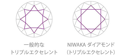 「NIWAKAダイアモンド」はカット評価の全ての項目が最高位エクセレントである「トリプルエクセレント」の評価を得ており、最も輝くダイアモンドと言えます。