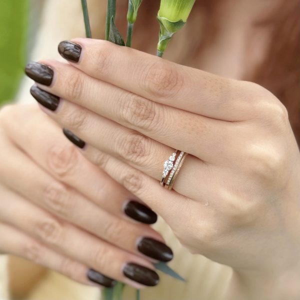 婚約指輪と結婚指輪が、重ねたときに最も美しく見えるように最初からセットとして設計されたリングのことを指します。ラインの角度、ダイヤの高さ、指あたりまで緻密に計算されているため、2本を重ねた瞬間に「これだ」と思える完成度が生まれるのが特徴です。