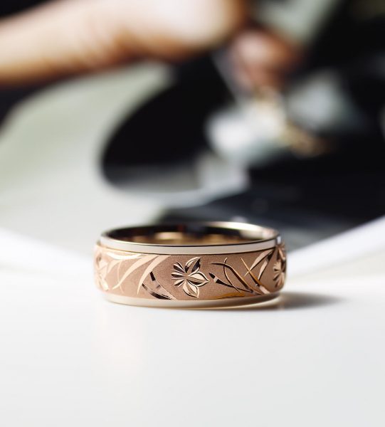 結婚指輪は毎日身につけるものだからこそ、着け心地も重要なポイントです。俄の指輪は、指に馴染むように計算されたデザインと、なめらかな内側の仕上げが特徴です。特に、指輪の内側を丸く仕上げた「内甲丸(うちこうまる)」のデザインは、指にフィットしやすく、長時間着けていてもストレスを感じにくいと好評です。仕事中や家事をしているときも快適に着けられるので、日常使いしやすい指輪を求める花嫁に支持されています。