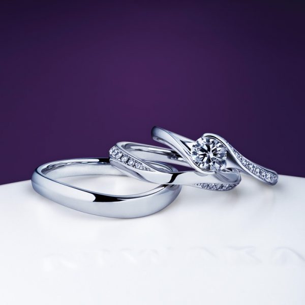 指輪をご紹介する前に「NIWAKA(俄 にわか)」についてお話いたします。NIWAKAは千二百年の歴史をもつ古都京都で誕生した和風ブランドです。京都で誕生した感性から生み出されたジュエリーには、日本の美意識が根付いています。NIWAKAの魅力の1つとして、全てのリングについている名前と詩があります。名前と詩には日本の美しい情景とおふたりを祝福する想いが込められています。ですので、おふたりが出逢った頃の思い出や想い、そしてこれからおふたりで歩む人生への決意・希望にふさわしいリングをお選びいただけます。