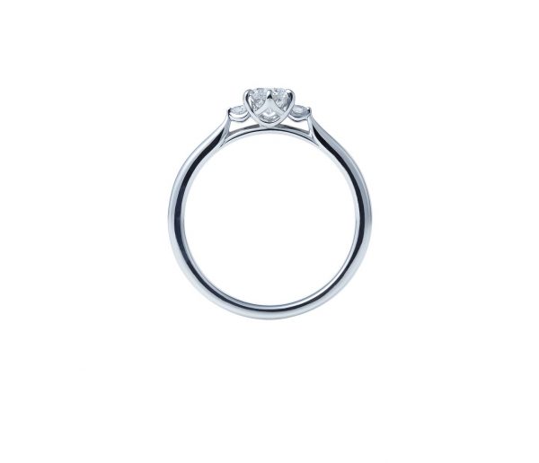 センターのダイアモンドを包む、丸みのある婚約指輪の形は、可憐に咲くすずらんをイメージしています。白鈴【しろすず】の特徴は正面からだけではなく、横からのフォルムがもとても可愛らしく、横から見るとお花のようになっているという隠された魅了もあります。