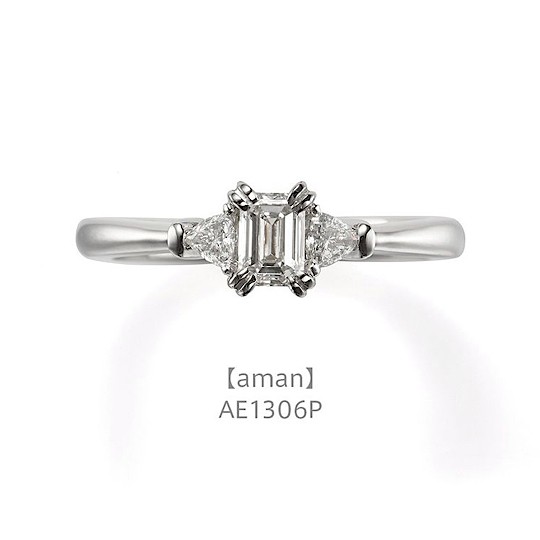 エメラルドカットダイヤと両サイドにセッティングした三角形のトリリアントカットダイヤが高級感を醸し出す華やかな婚約指輪。