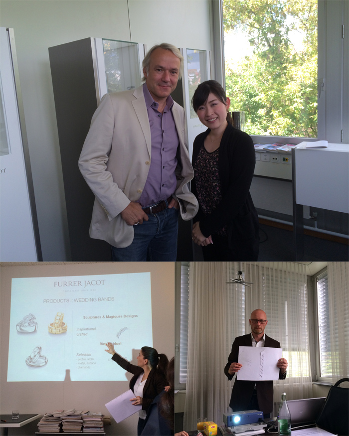 上)代表取締役社長ヴァルター・ホイザーマンと私 下左)商品説明をするクリスティナ、マネージャー 下右)新しいデザインについて説明するルーカス・ルプリ、専属デザイナーにFURRER-JACOTOの今後の戦略などについてそれぞれ貴重なお話を聞きました。