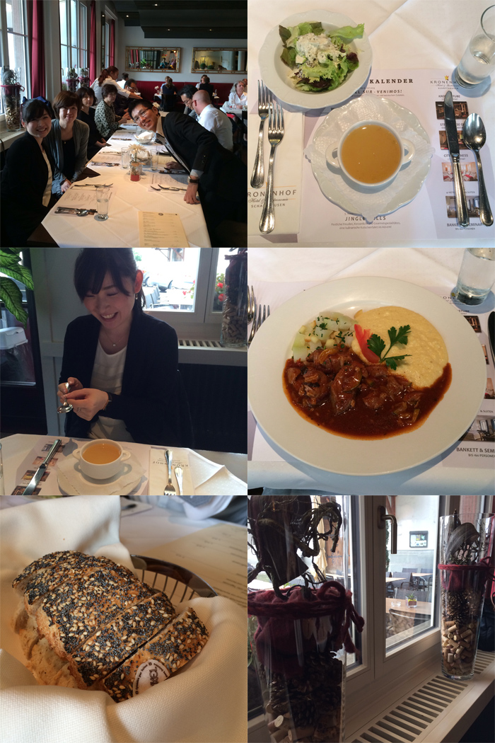 ランチはルーカス・ルプリ、専属デザイナーお勧めのシャフハウゼン市街の一般的なスイス料理のお店に連れて行っていただきました、※ドイツ、イタリア、フランスと国境を接するスイスは様々な国の料理のエッセンスを取り入れながらも、やや素朴な味付け、ちなみにミシュランガイドの星の数が人口当たり世界第2位の知る人ぞ知るグルメ王国なのです!!