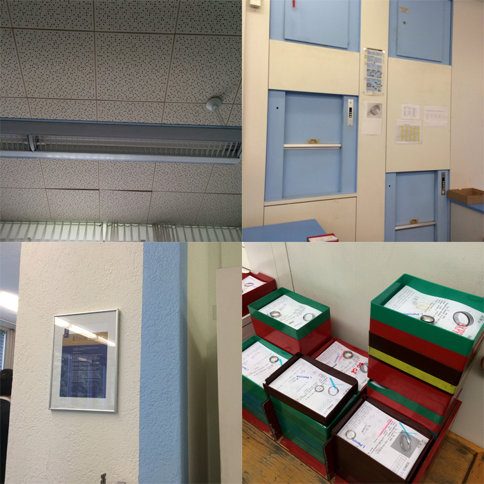 全オーダーを整理する部屋、削り出しをする部屋、ダイヤモンドセッティングの部屋・・・など、制作工程に合わせて工場の部屋を紹介して頂きました。ところどころにFURRER-JACOTOのテーマカラーの水色が!(スイスに流れるライン川からのインスパイア)