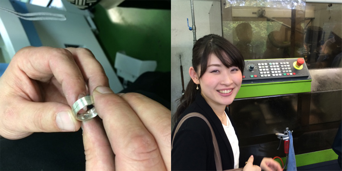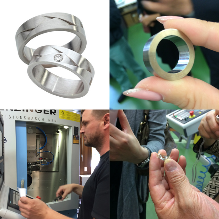 インゴットと呼ばれる貴金属材料の金属板を鍛造して鍛え込みフラージャコーの品質まで高めていきます。その金属板を先ずはドーナツ型のリングに打ち抜きます、これが稲穂をイメージしたリング、「トレース」になって行きます。打ち抜きされた材料を専用のマシーンにセットして、トレースだけに計算されたターッゲト数値(企業秘密)を入れ込みます。この時、写真右上の物を2つ削りだします。(詳しいリングの制作工程は旅3日目にご紹介いたします。)