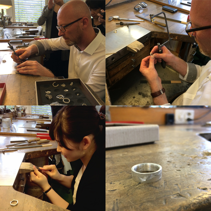 そして別の部屋へ移動し、自身もゴールドスミスであられるルーカス・ルプリ、専属デザイナーより一番重要であろう穂の模様出しの方法を直接レクチャーしていただきました!なんと私もこの稲穂の型の削り出しに挑戦!写真下左、そして世界最高峰のゴールドスミス直伝の技術で私“齋藤”が作ったリングがこちら。ジャン!