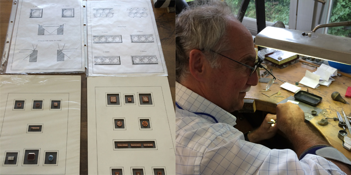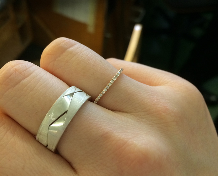 そして本日は左の写真の稲穂をモチーフにした「トレース」のつくり方を見学させて頂きました。トレースはもともと複雑な形のリングで稲穂の形を表現する為に2本のリングを組み合わせて作られています。