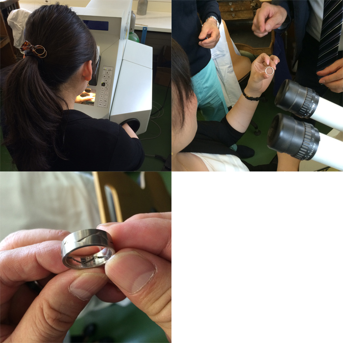 この覗いているレンズの先には銃の的の様な十字のマークが施されていて、溶接したい箇所をその十字のセンターに合わせてレーザーを発射します!最先端のレーザー溶接機です。ここで的の部分を指に当ててレーザー照射してみると・・・痛いです。私は百発百中!!才能あるかも!?(写真左下)よく見ていただくと内側の数か所溶接が完了しているのが見えると思います。実際のトレースはこの作業を全体に施していくそうです・・・気が遠くなる。見事溶接完了!