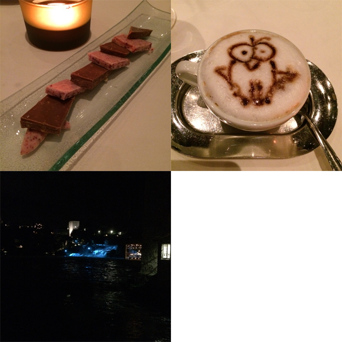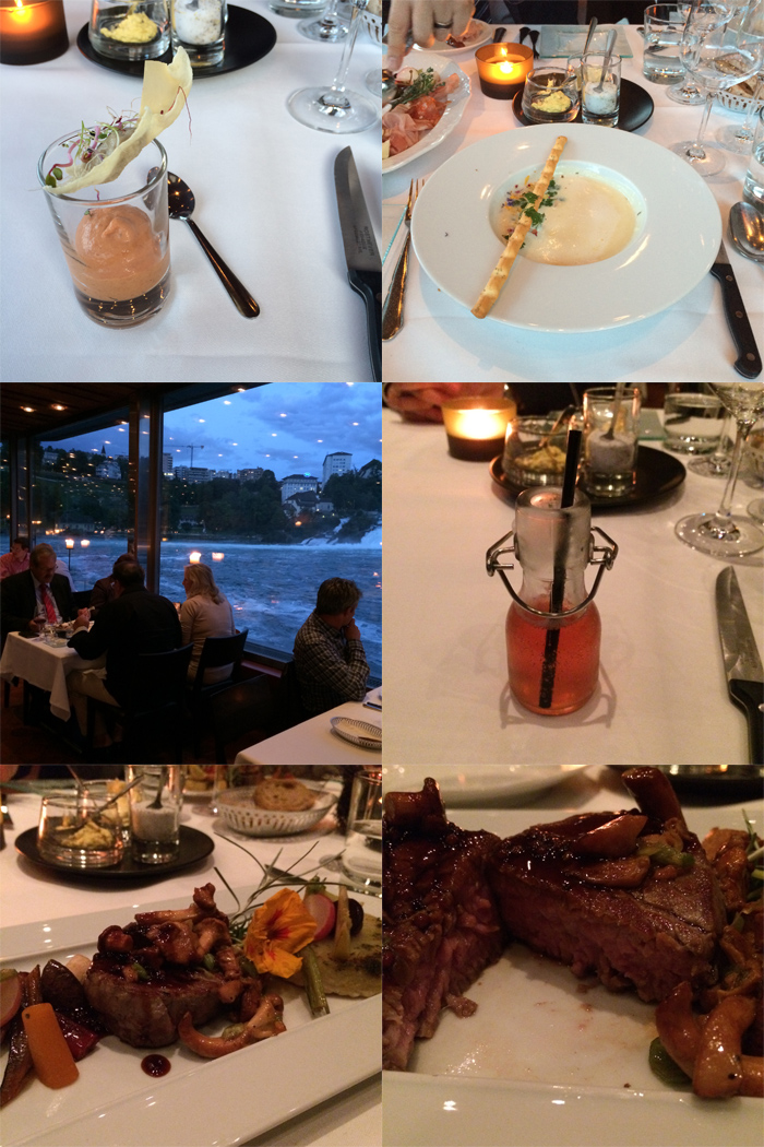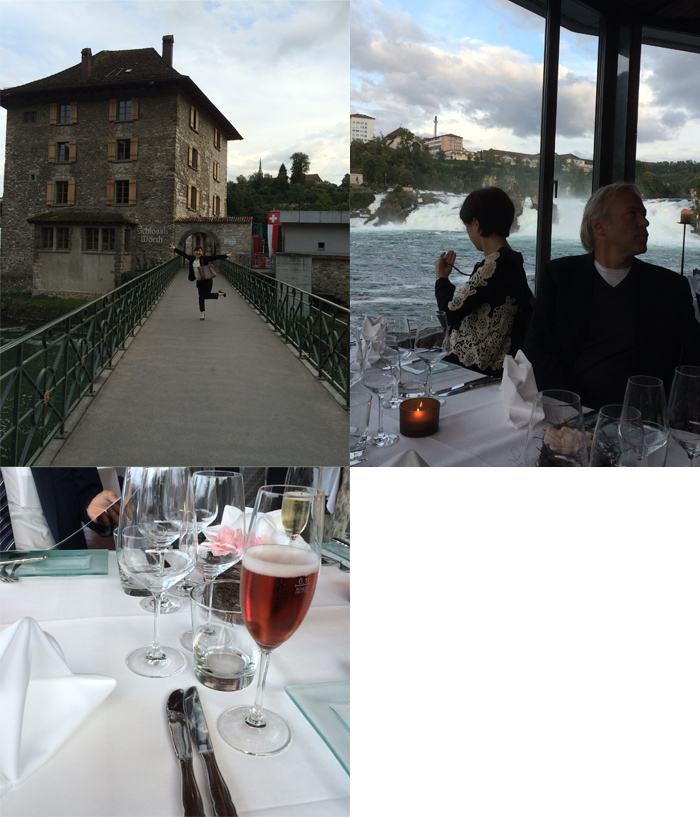レストランはこのラインの名瀑ラインの滝“Rheinfall“を一望できる凄いロケーションです。夕食はヴァルター・ホイザーマン社長も一緒です。