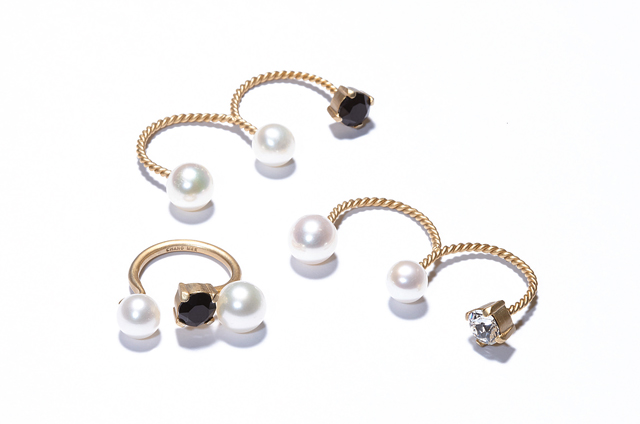 細い地金が肌になじみ、まるで指の上にパールとストーンを散りばめたように見える。 - ¥24,000+tax