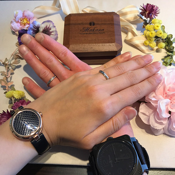 リングの幅や彫りのデザインなどお選びいただき、おふたりだけの特別な指輪ができあがってきました![]()
