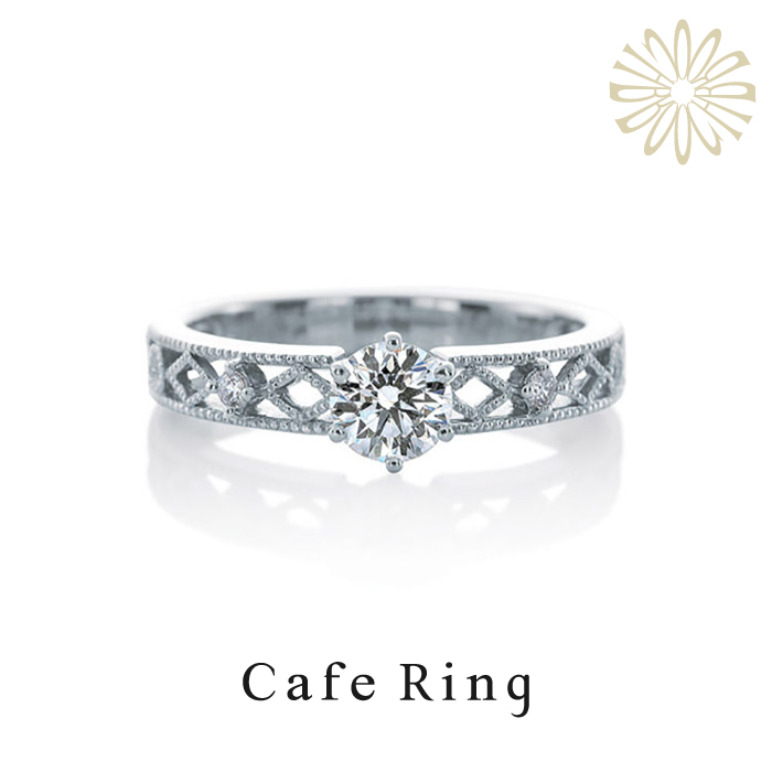 センターのダイヤモンドのセッティングと彫り模様が、なんともオシャレですよね♪