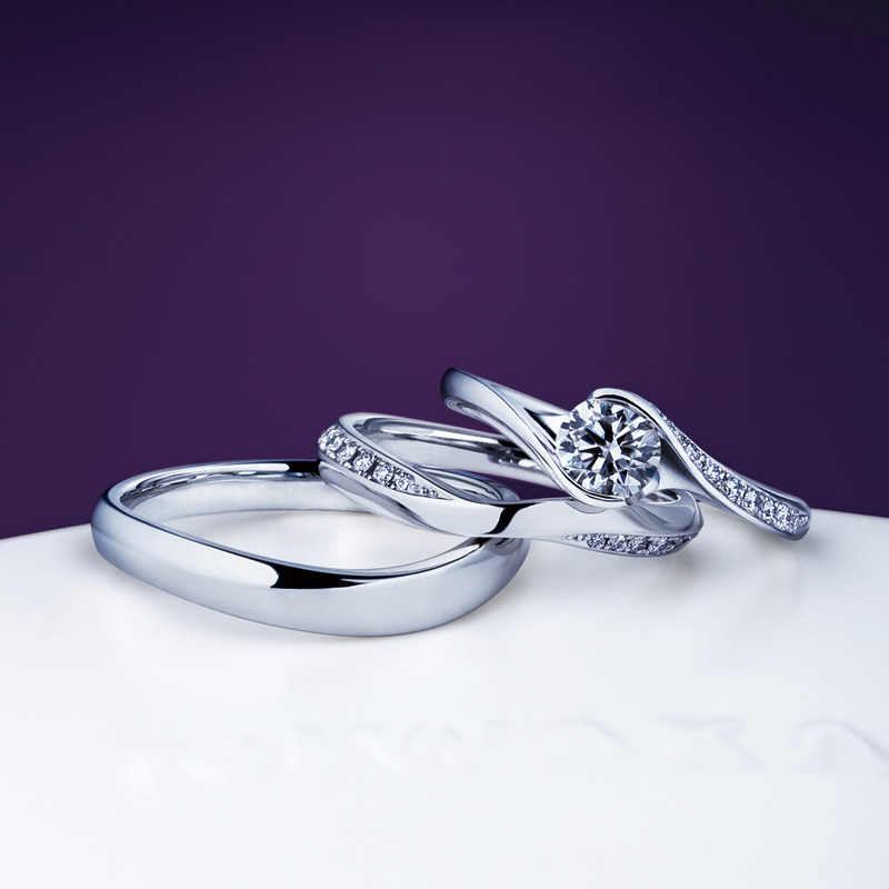 ギャラクシーには銀河や星雲などの他に”華やかな集まり、集合”という意味が有ります。星の流れの様な美しい曲線は華やかなさを集め、使う人をより輝かせてくれるでしょう。女性用リングにキレイにセッティングされたダイヤモンドは、お互いにキラキラと輝きを引き立て合います。男性用のリングはアントワープブリリアント用に開発したつや消しあらし技法のダイヤモンドマット。シックで落ち着いた印象になるので、男性人気も高いリングです。