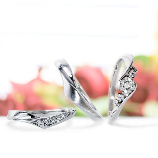 「純粋な心・信頼・優しさ」といった睡蓮の花言葉に想いを託しています。清らかな水面がふたりの愛という花を、いつまでも輝かせるように願いが込められています。睡蓮の花びらがふんわり開いているかのようなシルエット。ほかのV字ラインリングよりVの切れ込みが深くないのが特徴のリングです。シンプルですが、さりげないV字のデザインで男性からも人気のリングです。