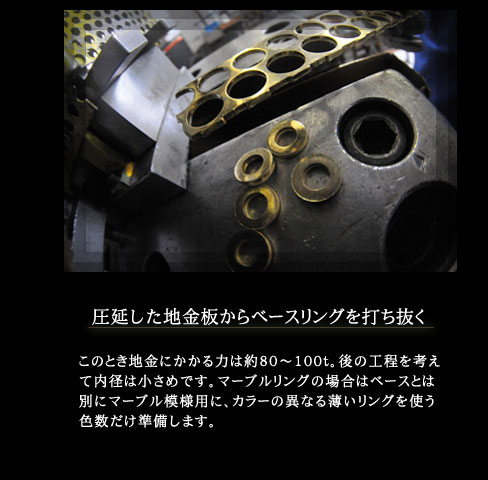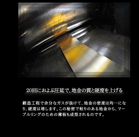 これは、地金を繰り返し圧延し、なめらかで弾力があり、丈夫で硬度の高い、たった一つのリングを作り上げる製法です。
