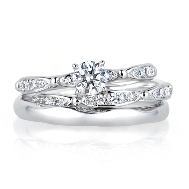 女性のマリッジリングに、このエンゲージリングを重ねると、やや細めのすっきりしたデザインもほどよいボリューム感のあるセットリングに。
