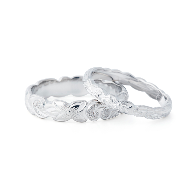 全周途切れのない彫模様を施したデザイン。NIWAKAでは、全国でも十人程しかその技を持つ職人がいない、寺社仏閣の装飾品などに用いられる飾り金具を作る、地彫り職人のひとりを迎え入れて制作を行っています。 日本古来の伝統的技術「彫金」が後継者不足とニーズの減少で廃れようとしている中、高い技術を生かし、ジュエリーに技を施すことで、身に着ける人にとって掛け替えのない品として伝統の技を次の世代に継承しています。 「花匠の彫」では、企画段階から和彫り職人と共に開発・監修をし、京都のアトリエにて日々制作を行っています。リングに施す彫模様は1本1本手彫り。たとえ同じデザインでも、全く同じものは2度と出来上がりません。おふたりのためだけの特別リングです。