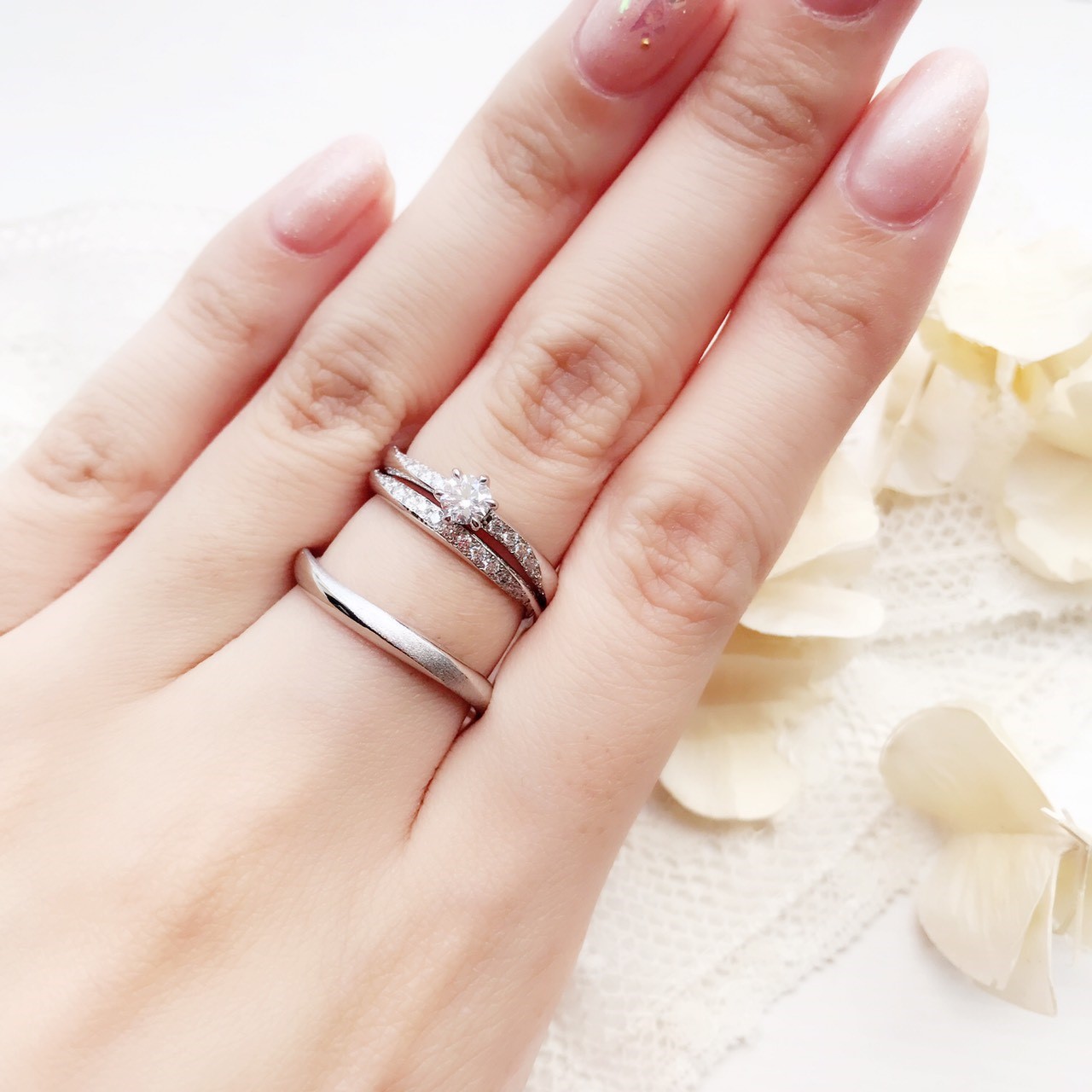 エンゲージリングはトップのダイヤモンドのサイドに小さなダイヤモンドがセッティングされていて、シンプルでかわいらしいデザインになっています。マリッジリングはひねりのラインがおしゃれですよね!レディースはダイヤモンドがセッティングされています。エンゲージリングとマリッジリングの重ね着けオススメです!ぜひ、おふたりの特別な日には重ね付けをしてください(*’▽’) マリッジリングにエンゲージを重ねることによって、”永遠の愛に封をする”という意味も込められているんです!なんだかステキですよね( *´艸`)