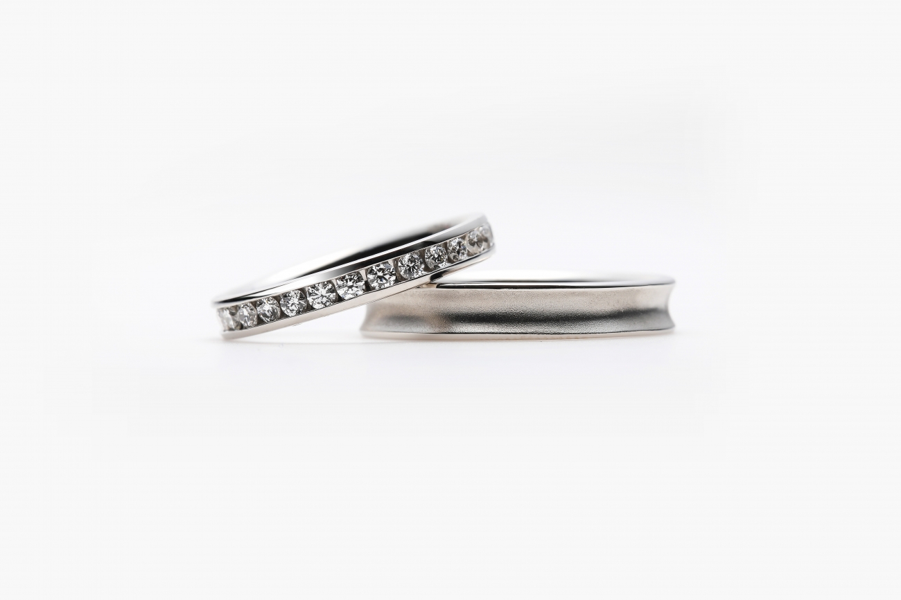 レディースリングはレール留めされたハーフエタニティタイプで華やかなデザイン。メンズリングはくびれのあるシャープなフォルムにマット加工が施されたアーバンデザイン。 - レディース・マリッジリング(結婚指輪)