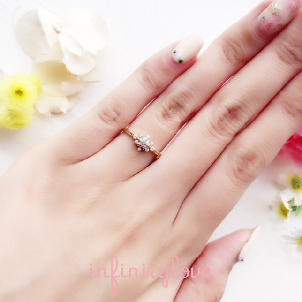 リングの腕は細身のイエローゴールドで、フォーマル感よりも使い易さがある方が好き!という方には、普段のお洋服にさらっと合わせられる可愛さでとってもオススメです。