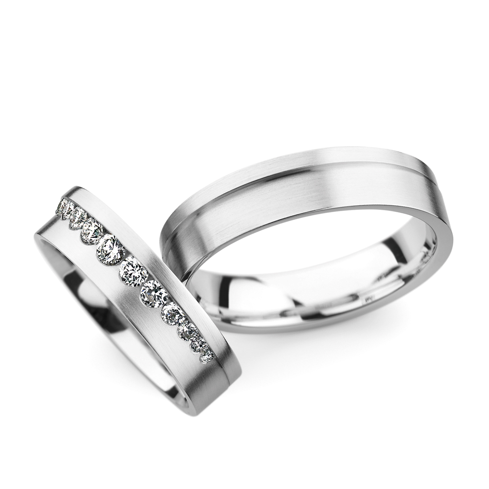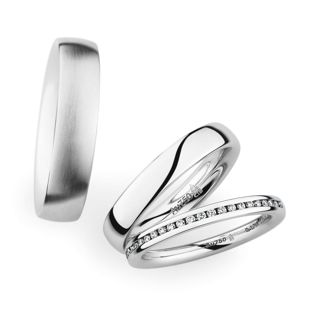 メンズは、溝のミル打ちの模様をお揃いにして、色は落ち着いたホワイトゴールドでお作りしています。