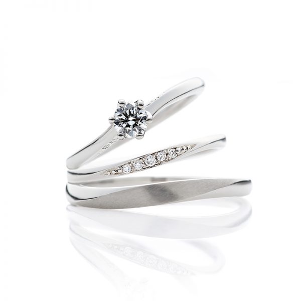 続いてご紹介するのがセットリングから「Voyage(未来への船出)」です!!運搬物資と共に人の思いも届けていた船。BRIDGE(ブリッジ)では、二人の祝福された船出が輝かしい未来へと向かって行くように願いを込めてデザインしています。 船の航海には昔から人生を重ね合わせて表現される事が多くあります。 穏やかな流れを進む二人の船を婚約リングに、船と水面の喫水線を輝くダイヤモンドでの表現をレディースマリッジリングに、メンズマリッジリングは船を”輝かしい未来へと”運ぶ”流れ”をデザインしています。 2人の人生の船出が輝かしい未来へ導かれ、素晴らしいものであるようにという願いが込められています。