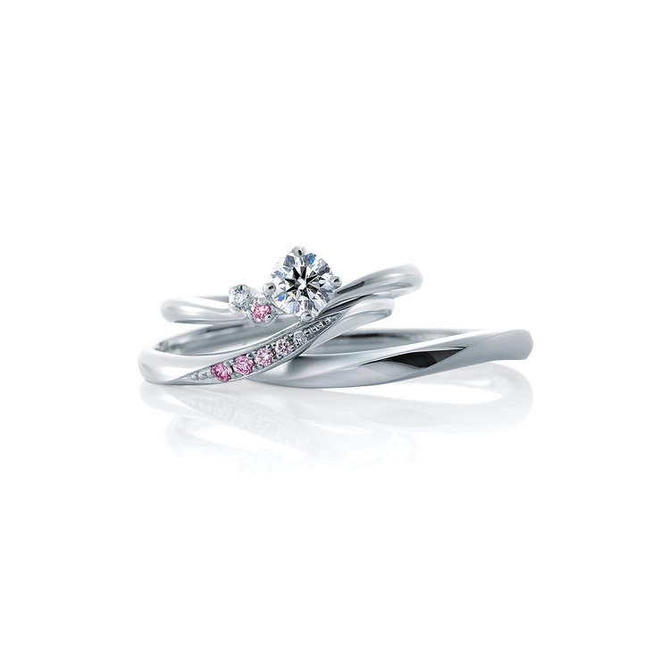 グラデーションのピンクダイヤモンドをあしらったリングはまるで大人の女性のフェミニンなウェディングドレスです。タキシードを着た時のようなきりっと感のあるメンズのリングと合わせると、ふたりはその日一緒になる、、、