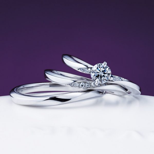 睡蓮の花びらがふんわり開いているかのようなシルエットが特徴です。ほかのV字ラインリングよりVの切れ込みが深くないのが特徴で、V字ラインは指を長く魅せてくれます。「純粋な心・信頼・優しさ」といった睡蓮の花言葉に想いを託しています。エンゲージメントリングは、純粋な気持ちを表すダイヤモンドを、大切に包み込んでいる様子を表現しています。ウェディングリングは、清らかな水面がふたりの愛という花をいつまでも輝かせるように願いが込められています。