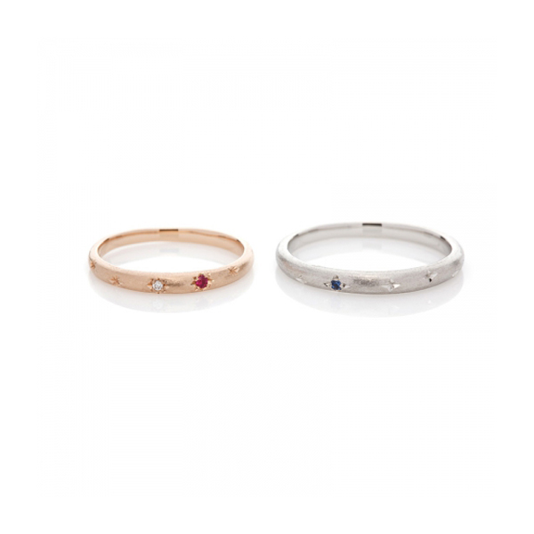 7月7日は七夕の日!!!七夕では織姫として知られている琴座の一等星ベガ、彦星は、わし座のアルタ イル。夫婦としては大先輩のこの二つの星は年に一度だけ天の川を渡って会う事が出来る運命の星です。天空でひときわ強く輝く二つの星は現代社会で頑張る二人のようでロマンチックで美しいですね!!!夫婦生活 は依存しすぎても一人で頑張りすぎても上手くいかないものです。なので、いつまでもお互いに思い合い力を合わせる夫婦の象徴として身に着けていほしい結婚指輪です。星のマークがちりばめられ、レディースリングには、ダイヤモンドとルビーがセッティングされています。メンズリングは、サファイヤがセッティングされています。