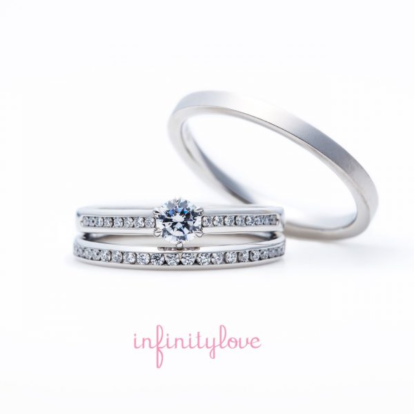 infinitylove(インフィニティラブ)のリングはマリッジリングとエンゲージリングがぴったりと重なるようにデザインされています。ですので重ね着けをおすすめいたします!セットリングはもちろんですが、他のエンゲージリングを合わせてもおしゃれです。店頭で自分好みの重ね着けを考えてみるのもおすすめいたします!