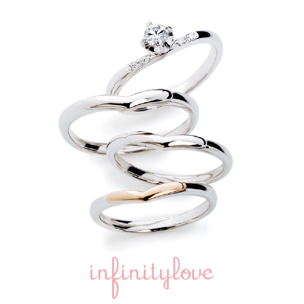 ブランド名でもあるinfinitylove(インフィニティラブ)には「無限大の愛」という意味があります。リングに付けられた名前ひとつひとつにおふたりの永遠の愛の願いが込められています。またデザインを担当するのが女性デザイナーなので、コンサバティでフェミニンな印象に加えて可愛らしくおしゃれなデザインのリングが数多くあります。そしてエンゲージリングとマリッジリングがぴったりと重なるようにデザインされています。重ね着けには”愛をロックする”という意味合いがあるのです!ですので重ね着けがおすすめです!!