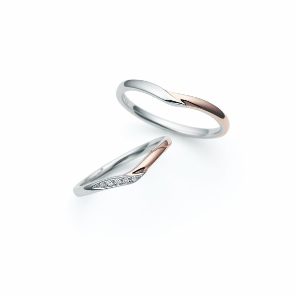 プラチナとピンクゴールドを使用した可愛いコンビリング。寄り添うようなデザインが、おふたりが今もこれからも、寄り添っている姿をイメージしています。V字ラインは指をスラっと長く見せる効果はあります。またこのラインに沿ってセッティングされているメレダイヤモンドがシンプルの中にも上品さを感じさせてくれます。