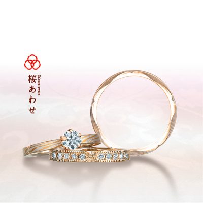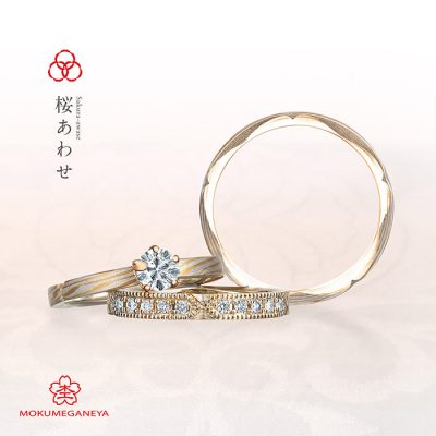 杢目金屋は、日本の伝統工芸技法を使いリングに木目模様を生み出す温かみのあるデザインが特徴のブランドで、二人だけの特別な婚約指輪や結婚指輪を作ることができるブランドです。そんな杢目金屋の中でも恋風はゆるやかなウエーブラインがきれいなセットリングです。婚約指輪はダイヤモンドを留める爪の部分に桜の花びらをイメージした飾りがつくところが可愛らしく、春の柔らかな風に舞う桜の花を表現しています。結婚指輪も指当たりのいいデザインでしっかりと木目模様を楽しむことができます。杢目金屋でしか出せないあたたかな風合いと桜のデザインが春入籍のカップルさんにピッタリです。
