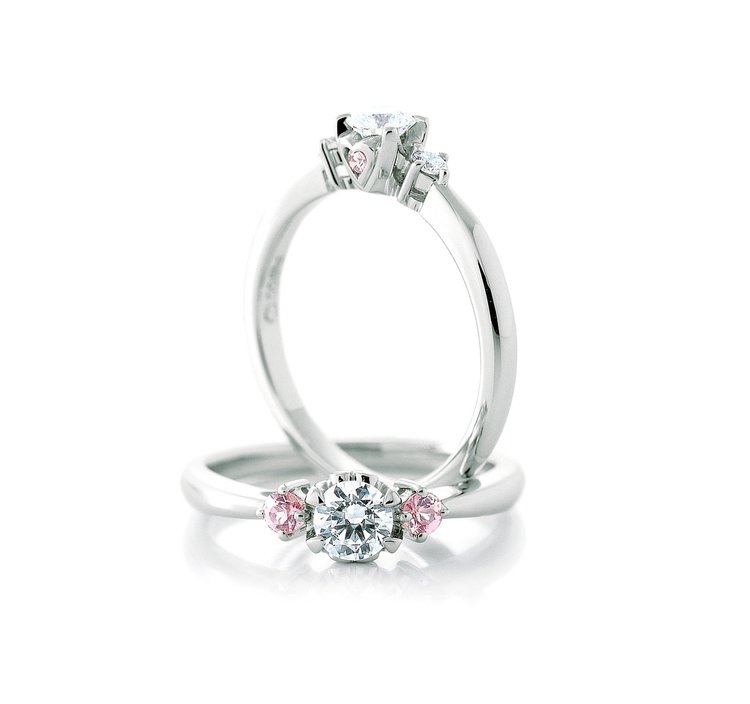 続いてご紹介したいのが「俄(にわか)」の”茜(あかね)”です。俄は女性から人気の高いブライダルブランドのひとつです。その中の茜は、メインのダイヤモンドのサイドにセッティングされている石にピンクサファイヤを使用にした華やかでかわいいデザインです。ピンクサファイヤには恋愛成就の意味があります。また石言葉には「成功」という意味もあるので、プロポーズが大成功すること間違えなしです。