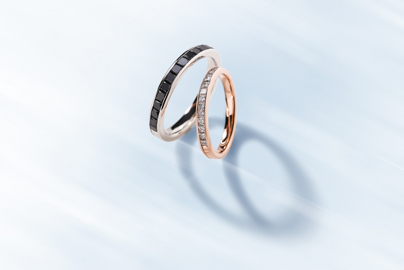 女性デザインはプラチナとピンクゴールドのコンビネーションデザインで、男性デザインはプラチナとホワイトゴールドのコンビネーションになっています。フラット(平)な形状がスタイリッシュな雰囲気を出してくれます。そして目を引くのが、縦に並んだダイヤモンドとブラックダイヤモンドです。女性のみならず男性デザインにもアクセントがあることで、より存在感がアップします。