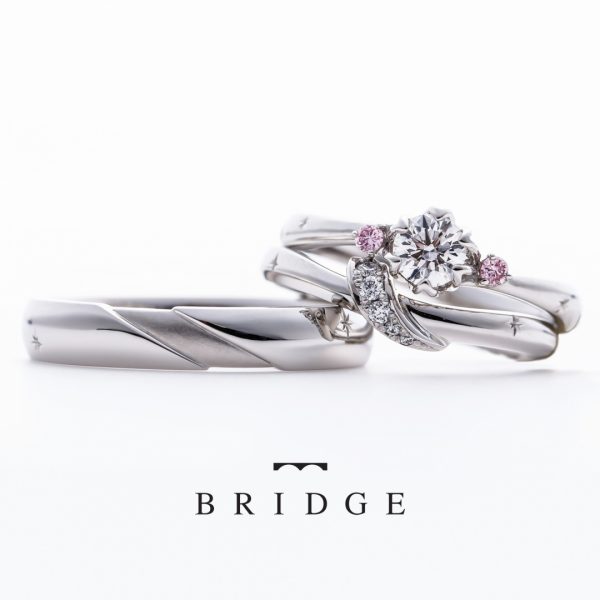 ブリッジは、新潟のデザイナーによってデザインされているブランドで、婚約指輪と結婚指輪がふたりの架け橋になるようにと願いが込められています。そんなブリッジの中でもひときわ可愛さを放っているのがこの”春の足音”です。春の足音は、春を告げる福寿草“雪割り草”をイメージしてデザインされており、雪割り草の花言葉は『永久の幸せ』『幸せを招く』です。婚約指輪と結婚指輪にぴったりの意味がありますよね!婚約指輪は、メインのダイヤモンドの両サイドにピンクダイヤモンドをセッティングしており、より春の彩りを感じることができます。婚約指輪と結婚指輪両方のプラチナ部分にキラキラ輝く光をイメージしたラインのデザインが入っており、他にないオリジナリティを楽しむことができます!新潟の春といえばこの春の足音が一番です!