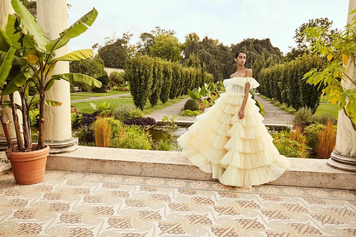 例えば、写真のようなレイヤーがたっぷりとついたふんわりしたドレスや方のところがふわっとしているパフスリーブのドレスが今旬です。80年代にもこのような華やかなドレスが流行りました。ダイアナ妃にインスパイアされたようなロマンチックなドレスでモダンなものを選ぶのがオススメです!ドレスが華やかな分ヘアスタイルはすっきりまとめるのがいいです!また、和装ヘアから火が付いた金箔が、ドレスでもブームになる予感!シンプルで大人っぽい雰囲気が魅力的だそうです。